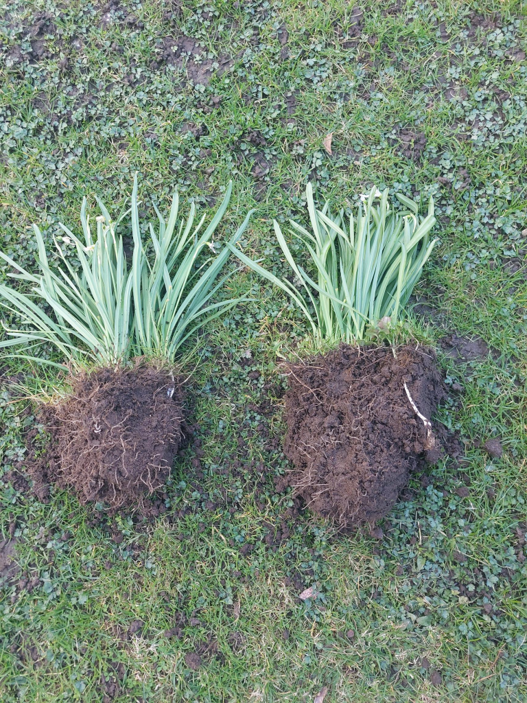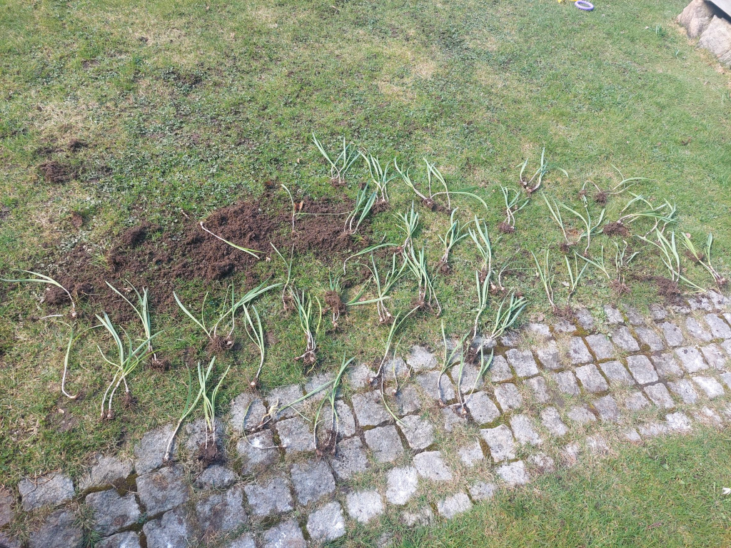 Uppdatering. Ja, en sak har jag lärt mig nu. Jag ska inte vara ”effektiv” och skriva ett utkast till inlägget innan jag har gjort det jag skrivit om. Jag trodde på allvar att hela proceduren skulle gå ganska snabbt, men jag hade uppenbarligen glömt hur det var när jag gjorde samma sak med en del av påskliljorna föregående vår. O Ä N D L I G T många lökar i en tuva var det då! Samma sak var det med snödropparna, bara det att själva lökarna rent storleksmässigt var mindre. Tack och lov grävde jag inte upp alla tuvorna utan bara de största. Varje tuva snödroppar hade cirka 50-60 lökar. Huha.