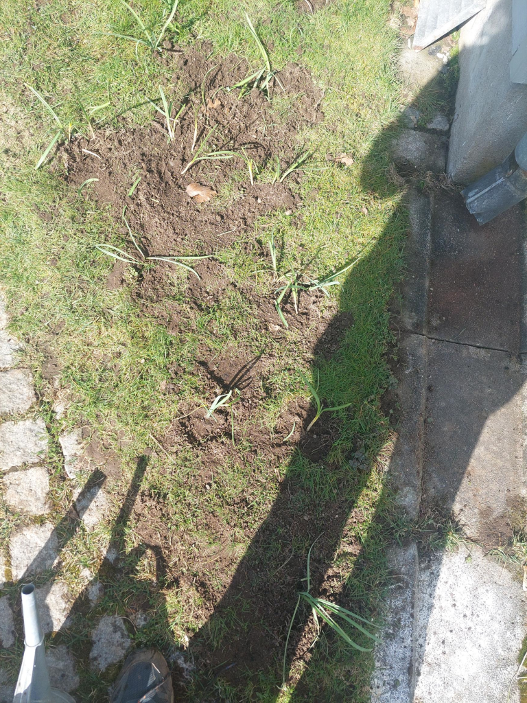 Jag vet dock att jag kommer tacka mig själv nästa vår men herregud vilken tid det tog att få ner alla i jorden igen inklusive gödsel och vattning. Men nu är det gjort i alla fall även om det i bilden nedan ser ut som att något djur grävt i gräsmattan.