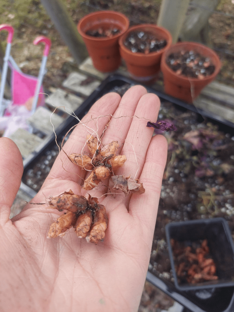 När hösten närmar sig och det blir allt mörkare ute, ja då sätter jag in de i förrådet (hyfsatfrostfritt), där de får vissna ner och stå i mörkret utan vatten tills vårsolen är kommen. Då plockar jag isär jordklumpen och tar rätt på knölarna. De placeras därefter i ny jord med ett 1-2 cm lager jord på sig. Det dröjer inte länge innan de börjar växa till sig.