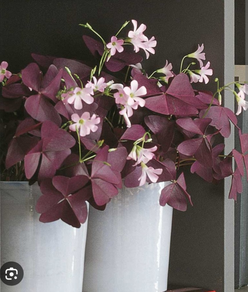 Triangeloxalis (vetenskapligt namn: Oxalis triangularis) heter den. Ni känner säkert igen den när den står i sin fulla prakt med sina mörkröda, triangelformade blad, eller hur? Små och söta blommor får den också i rosa. Dessa tar dock kraft från växten som jag uppfattat det så de tar jag bort. Jag tycker även att de är som vackrast med enbart bladverket, liksom med funkia (vetenskapligt namn: Hosta). Men det är såklart en smakfråga.