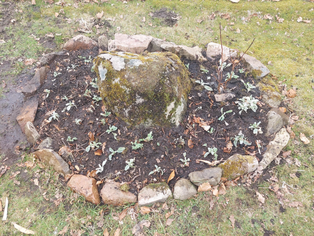 Runt den stora stenen och längs övre delen av den vänstra delen av rabatten har jag delat på mina välvuxna plantor av den klassiska kärleksörten (Hylotelephium ’Herbstfreude’). Det är verkligen en otroligt användbar perenn tycker jag. Lätt att sköta om och att dela för att få fler plantor och vacker långt in på hösten med sina stora, rosa blommor. och friska gröna bladverk